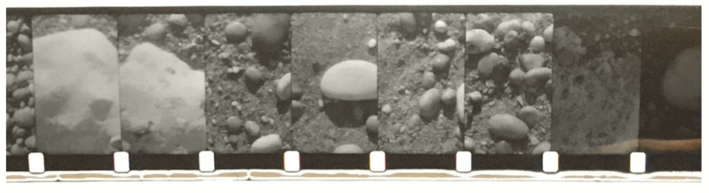 A 16mm camera held against the artists stomach and pointed at the ground, takes a single frame every 12 steps during an 18 mile walk along the length of Chesil Beach in Dorset, UK.