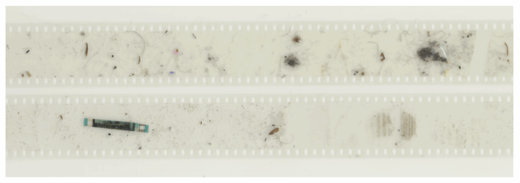 Lost Property is a film made in response to Ian Breakwells exhibition at the Arnolfini during a BEEF residency. 35mm splicing tape was applied to the floor underneath every seat of the auditorium of both the Cube and the Arnolfini. The tape collected the dust and debris which laid dormant under the seats, this was then applied directly to clear 35mm motion picture film. Each auditorium had its own roll of film which was projected via the auditorium’s two 35mm projectors and superimposed on top of each other.
